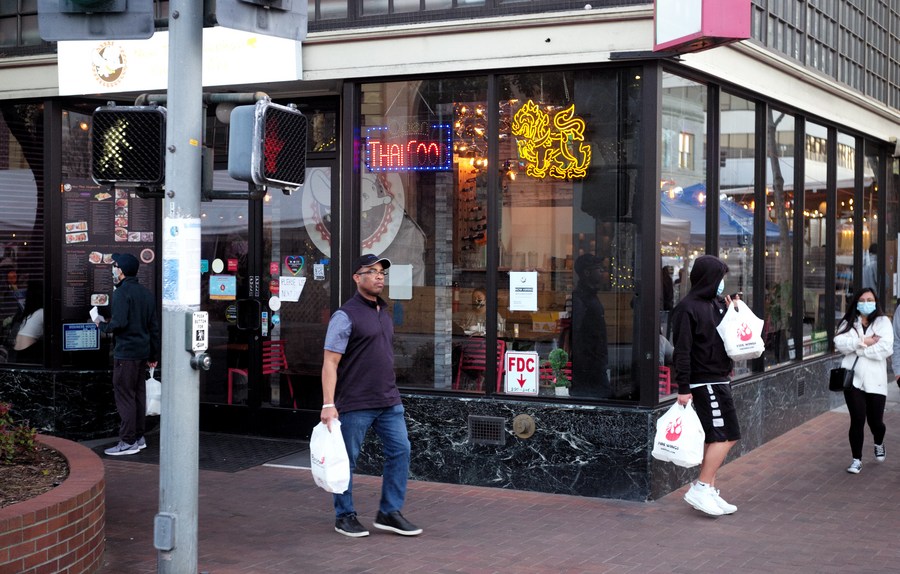 People holding take-away food walk past a restaurant on a business street in San Mateo, California, the United States, March 26, 2021. (Xinhua/Wu Xiaoling)
