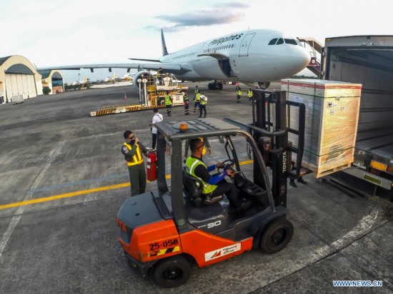 A staff member transports cargo containing the first batch of government-purchased Sinovac COVID-19 vaccines upon their arrival in Manila, the Philippines, March 29, 2021. The Philippines on Monday received the first batch of the Sinovac COVID-19 vaccines its government has purchased from China. (Xinhua/Rouelle Umali)