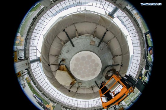 Photo taken with a fisheye lens on March 28, 2021 shows staff members conducting maintenance work on the feed cabin of the Five-hundred-meter Aperture Spherical Radio Telescope (FAST) in Pingtang County, southwest China's Guizhou Province. Starting formal operations in Jan. 11, 2020, the FAST is believed to be the largest and most sensitive radio telescope in the world, which has a huge potential for verifying and exploring mysteries of the universe. (Xinhua/Ou Dongqu)