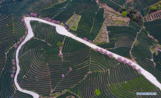 Aerial photo taken on March 29, 2021 shows a view of cherry blossoms in a tea garden at Bashan Village, Fuyang District, Hangzhou City in east China's Zhejiang Province. (Xinhua/Xu Yu)
