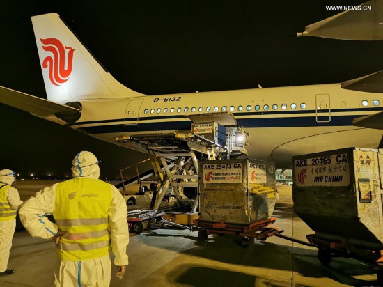 Workers unload CanSino COVID-19 vaccines at Islamabad International Airport in Islamabad, Pakistan, on March 30, 2021. The first batch of CanSino COVID-19 vaccines that the Pakistani government purchased from China arrived here Tuesday night. (Str/Xinhua)
