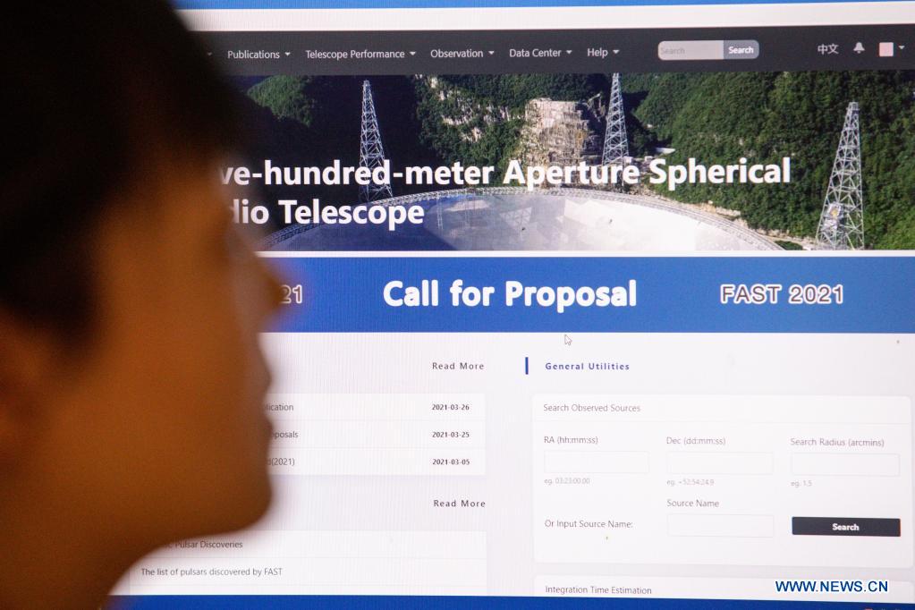 An engineer of China's Five-hundred-meter Aperture Spherical Radio Telescope (FAST) shows the website to submit applications for observations, southwest China's Guizhou Province, March 31, 2021. China's Five-hundred-meter Aperture Spherical Radio Telescope (FAST), the world's largest single-dish and most sensitive radio telescope, officially opened to the world starting Wednesday. (Xinhua/Ou Dongqu)