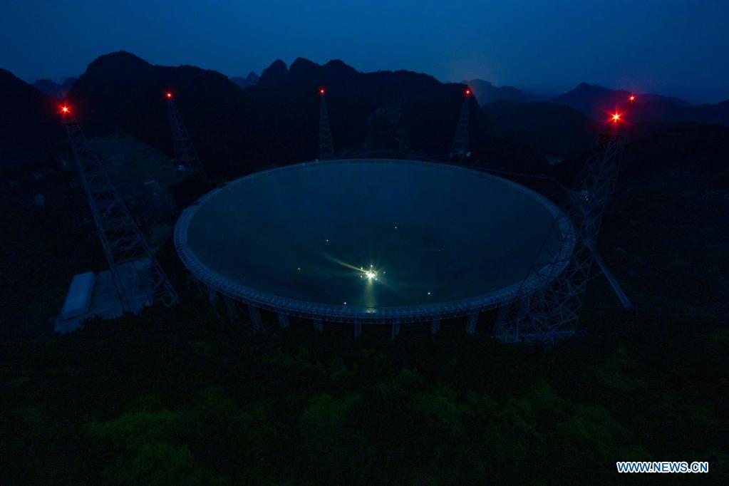Photo taken on March 30, 2021 shows China's Five-hundred-meter Aperture Spherical radio Telescope (FAST) under maintenance at night in southwest China's Guizhou Province. China's Five-hundred-meter Aperture Spherical Radio Telescope (FAST), the world's largest single-dish and most sensitive radio telescope, officially opened to the world starting Wednesday. (Xinhua/Ou Dongqu)