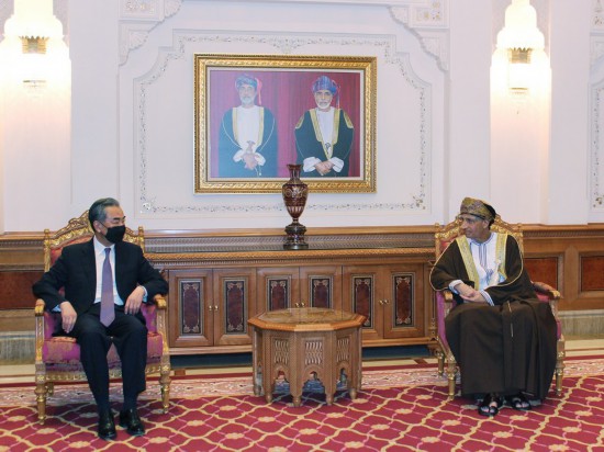 Visiting Chinese State Councilor and Foreign Minister Wang Yi (L) meets with Omani Deputy Prime Minister for the Council of Ministers Sayyid Fahd bin Mahmoud Al Said in Muscat, Oman, March 29, 2021. (Photo by Khaled Orabi/Xinhua)