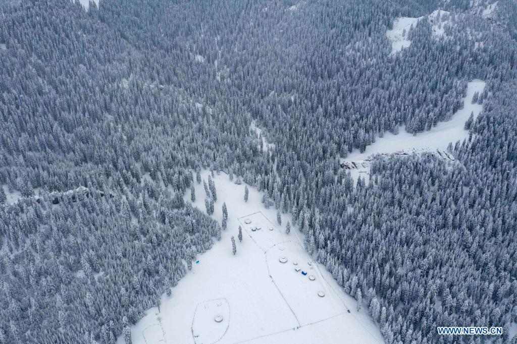 Aerial photo shows the snow-covered forest of Tianshan Mountains in Shawan City, northwest China's Xinjiang Uygur Autonomous Region, March 30, 2021. (Xinhua/Hu Huhu)