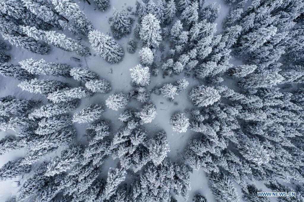 Aerial photo shows the snow-covered forest of Tianshan Mountains in Shawan City, northwest China's Xinjiang Uygur Autonomous Region, March 30, 2021. (Xinhua/Hu Huhu)