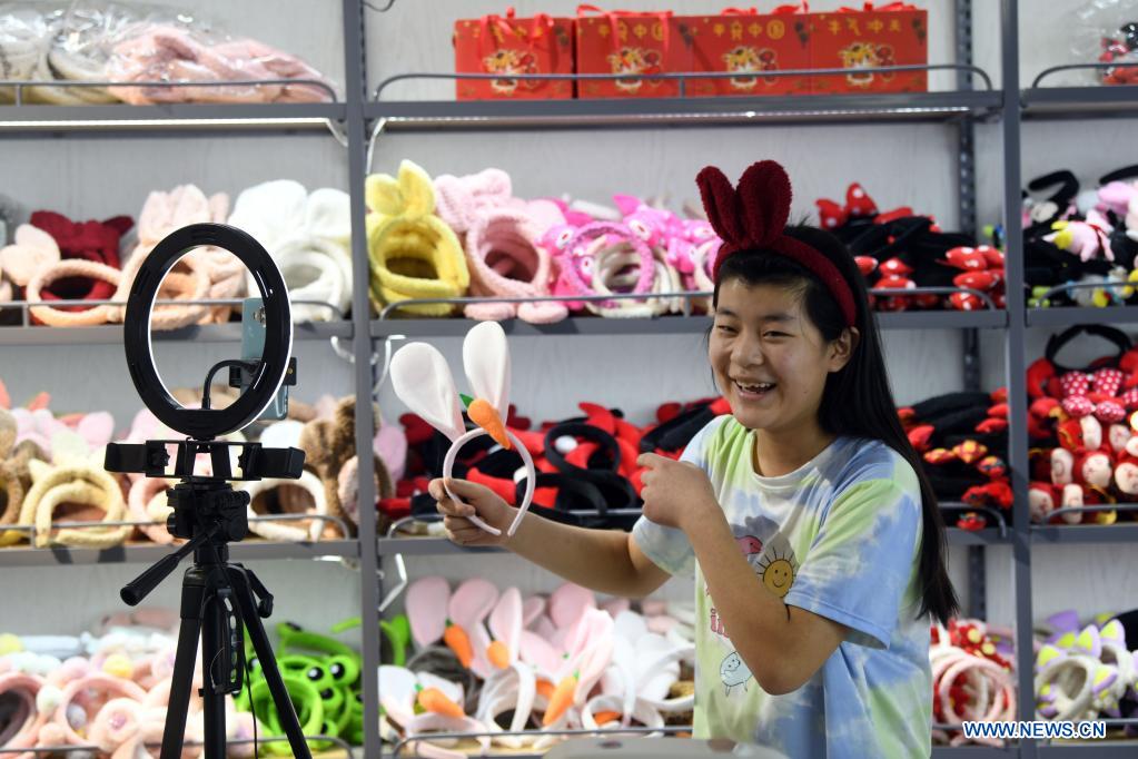 A woman promotes products via livestreaming in Baigou New Township of Baoding, north China's Hebei Province, March 30, 2021. Baigou New Township have established livestreaming platforms for local enterprises so as to boost local economy in recent years. (Xinhua/Jin Liangkuai)