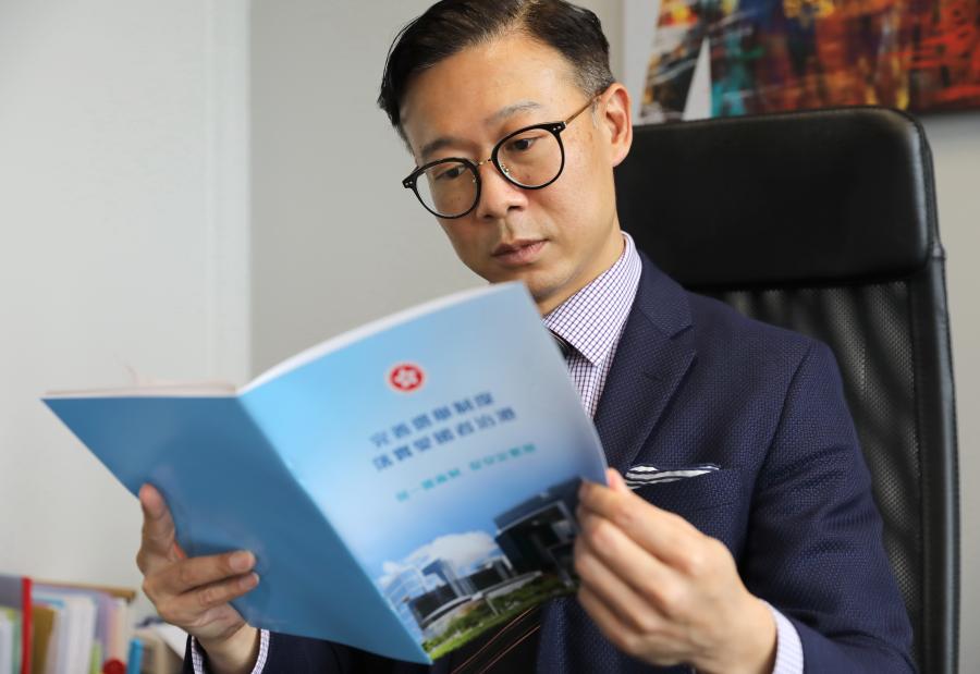 Horace Cheung, the newly-elected deputy chairman of a Legislative Council subcommittee on improving Hong Kong's electoral system, receives an interview with Xinhua in Hong Kong, China, March 30, 2021. (Xinhua/Wu Xiaochu)
