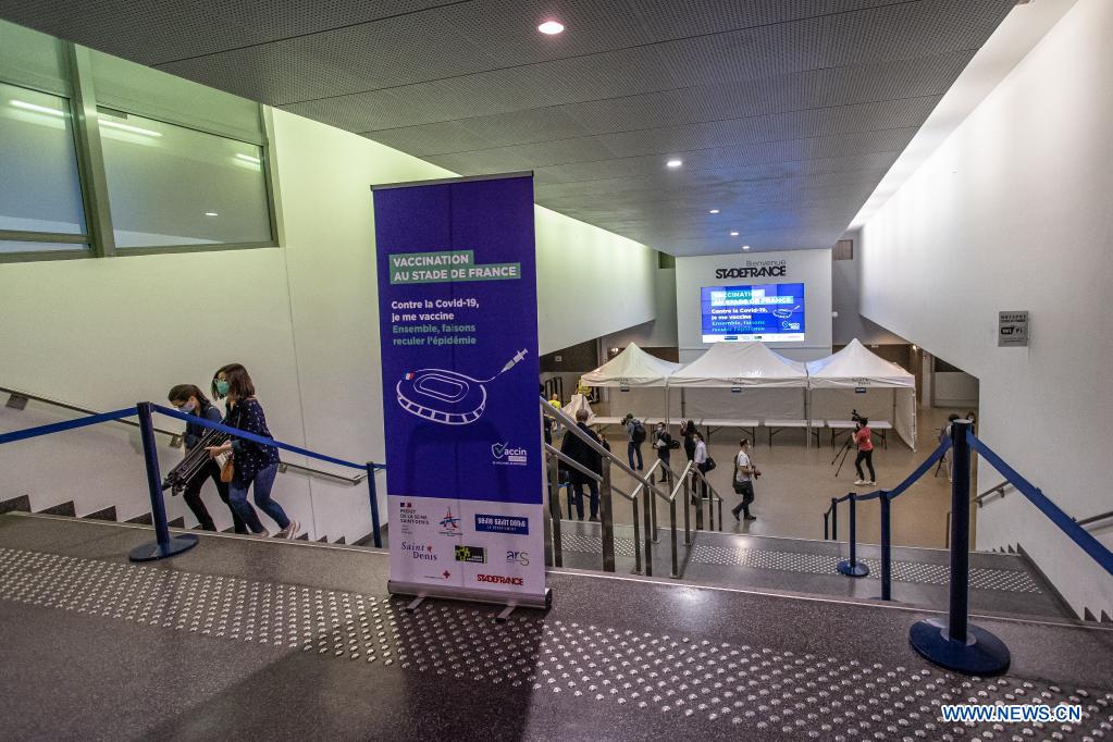 People walk past a sign of a new COVID-19 vaccination center in Saint-Denis, France, on March 31, 2021. Starting from mid-April people over 60 in France will be able to get vaccinated, from May 15 the vaccination will be open to people aged between 50 and 60 and from mid-June the age limit will be lifted, said French President Emmanuel Macron on Wednesday. (Photo by Aurelien Morissard/Xinhua)