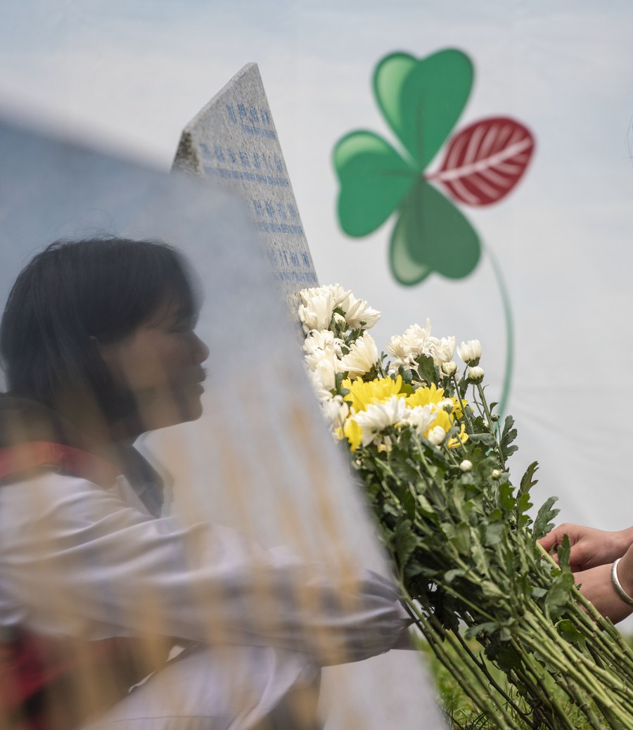 A volunteer lays flowers in front of a monument in honor of organ donors during a commemorative event held at a human organ donor memorial park in Kunming, southwest China's Yunnan Province, April 3, 2019. (Xinhua/Jiang Wenyao)