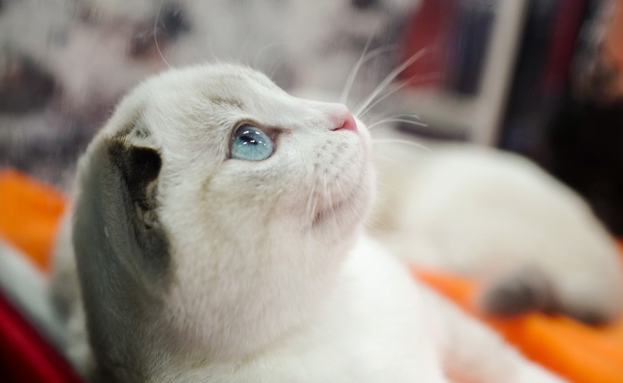 A cat is seen at a booth during the KoShariki Cat Show at the Sokolniki Exhibition and Convention Center in Moscow, Russia, on Jan. 4, 2018. (Xinhua/Bai Xueqi)