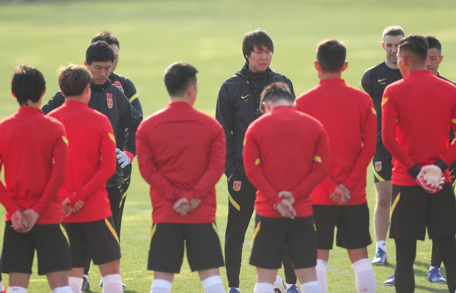 Li Tie (C), head coach of Chinese men's national football team, gives instructions, March. 22, 2021. (Xinhua/Ding Ting)
