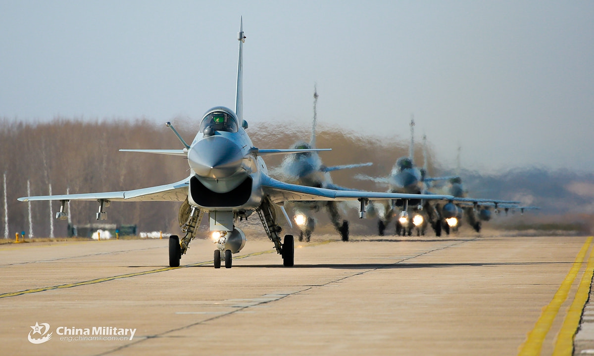 Four pilots and two instructors assigned to an aviation brigade of the air force under the PLA Northern Theater Command taxi their fighter jets on the flightline in formation during a flight exam on February 26, 2021. The four pilots have just completed the training on flight combat skills, which focused on aerial confrontation and flexible tactical options, aiming to enhance the flying skills and tactical cooperation among the pilots. Photo: China Military Online