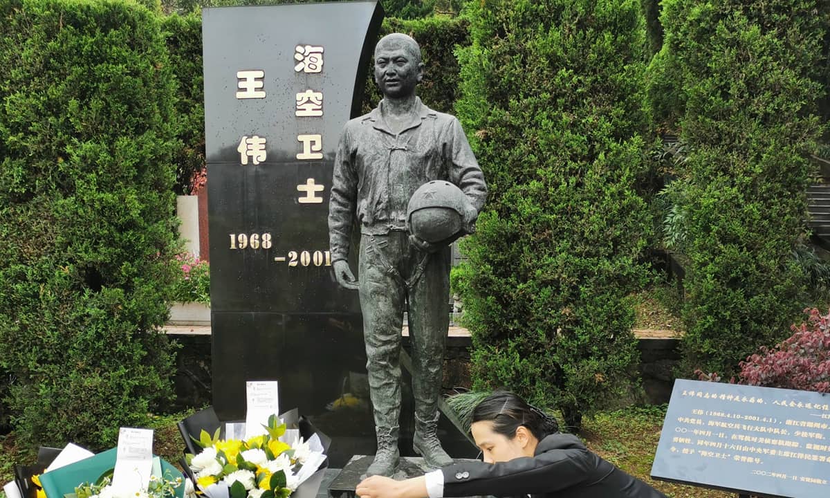 A staffer on Thursday tidies the cenotaph of Wang Wei, a heroic PLA pilot who went missing and assumed dead after his plane collided with a US spy aircraft 20 years ago. People sent flowers and notes to the hero during a commemoration in Hangzhou, East China's Zhejiang Province. Photo: Xinhua
