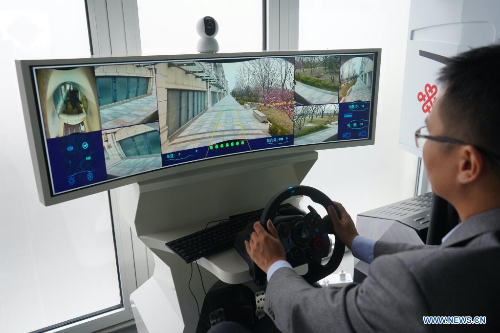 Ren Dakai, who is in charge of Xiongan digital transportation lab, manipulates an unmanned vehicle in the lab in Xiongan New Area, north China's Hebei Province, March 26, 2021. The Xiongan digital transportation lab is committed to digital transportation research to boost smart city development. (Xinhua/Jin Haoyuan)