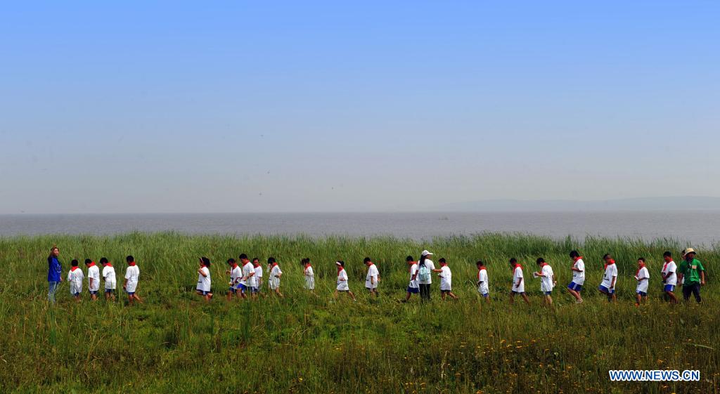 File photo taken on July 20, 2014 shows volunteers leading primary school students for bird observation at a wetland in Shenyang, northeast China's Liaoning Province. The Shenyang Raptor Rescue Center is home to injured raptors of all kinds. Wang Weiyan, 58, is the director of the center. Out of deep love for birds, Wang became a volunteer in bird protection. He works as a raptor rehabilitator and has devoted the most precious years of his life to bird care. Established in July 2009 by a group of bird lovers and bird protectors, the Shenyang Raptor Rescue Center has three rescue bases, a cooperative pet hospital, an online WeChat group, and more than 180 volunteers. The volunteers have various occupations such as zoologists, doctors, journalists, teachers, students, workers, farmers and many other professions. The center works on the treatment of injured raptors and birds that are unable to survive independently in the wild. It has so far rescued more than 3,000 wild birds, with the survival rate reaching 70 percent. More than 90 percent of the survivors have been successfully released into nature. Wang Weiyan, who has been engaged in the rescue of raptors for 25 years, is now a bird saving master. He can cure a variety of bird diseases, and he is also willing to pass on his experience to more young people. Now, more young volunteers have joined in the bird protection work. They publicize the knowledge of bird protection in an easy way on the popular Chinese short-video social media platform Douyin. On March 14, more than a dozen once injured goshawks, kestrels, vultures, and eagle owls were released at the Shenyang Raptor Rescue Center. To the bird protection volunteers, it was the happiest moment to see the birds returning to the sky. (Xinhua/Yang Qing)