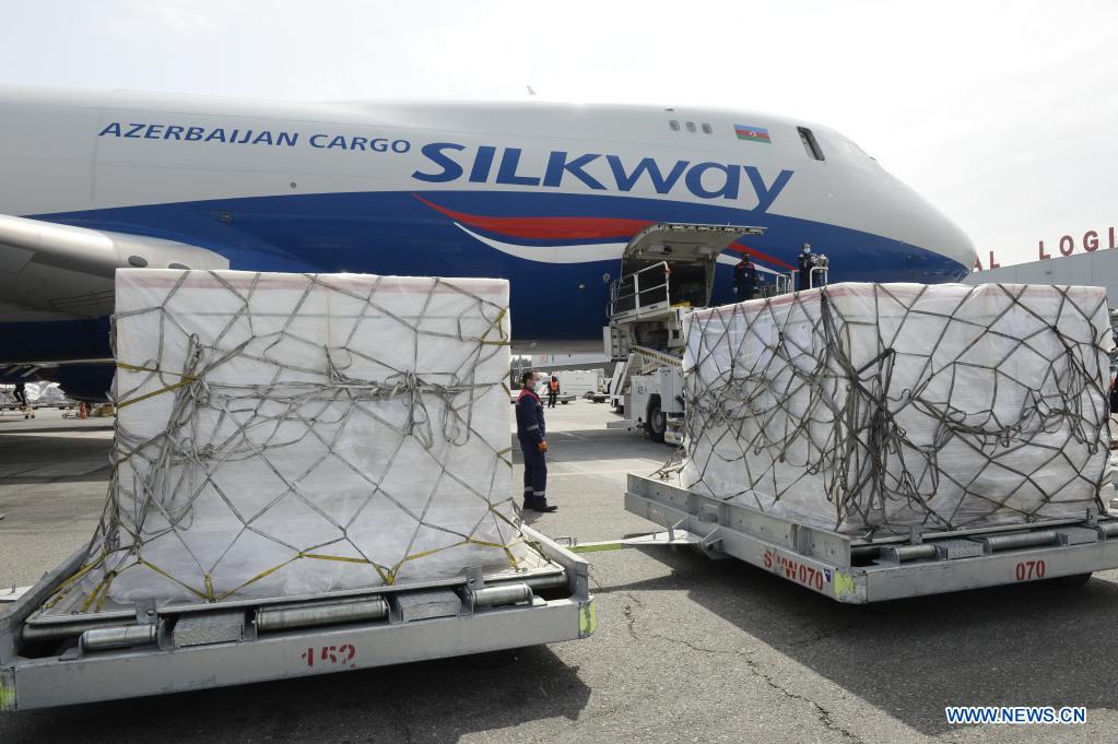 Staff members unload the newly-arrived vaccines, manufactured by China's biopharmaceutical company Sinovac Biotech, at the airport in Baku, Azerbaijan, April 1, 2021. Azerbaijan on Thursday received the first batch of COVID-19 vaccines it has purchased from China as part of efforts to curb the spread of COVID-19. (Photo by Tofik Babayev/Xinhua)