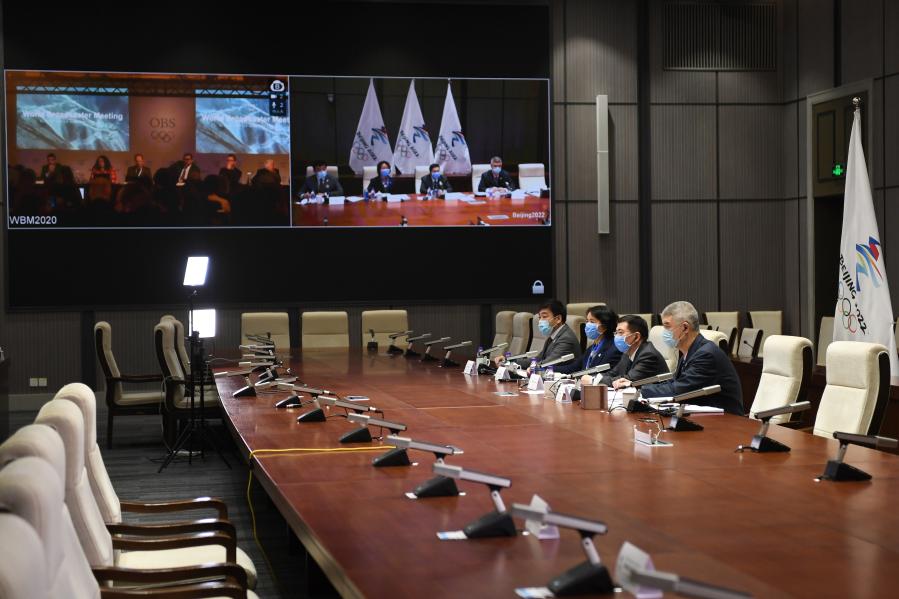 Zhang Jiandong (2nd R), Vice Mayor of Beijing and Executive Vice President of Beijing 2022, attends the Olympic Broadcasting Services (OBS) World Broadcaster Meeting (WBM) online at Shougang headquarters in Beijing, capital of China, Feb. 24, 2020. (Xinhua/Ju Huanzong)
