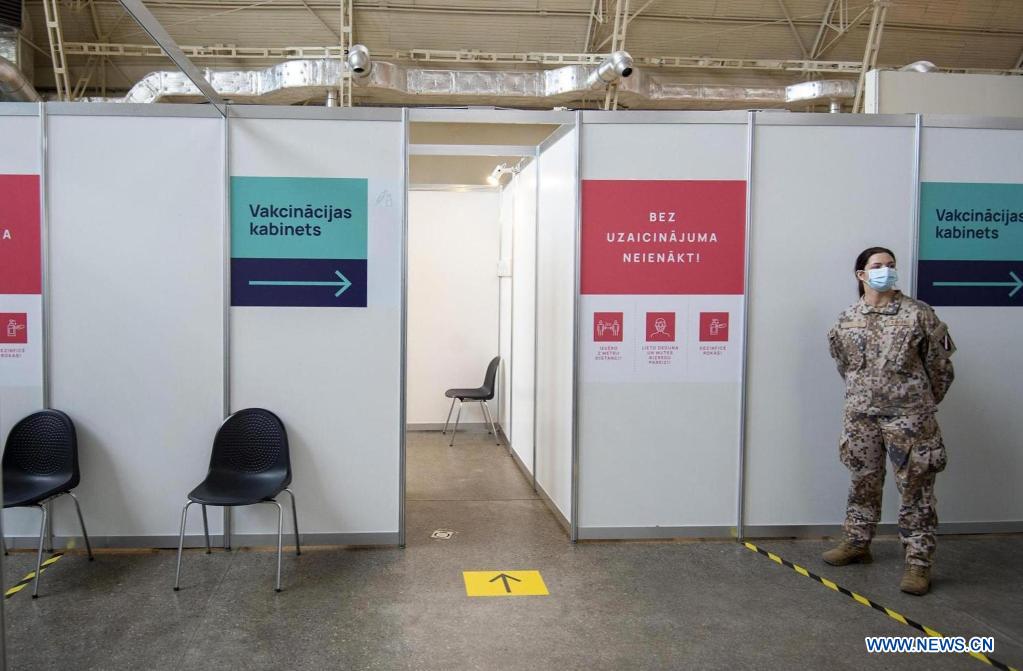 A soldier guards in the vaccination center in Riga Central Market, Riga, Latvia, April 1, 2021. A batch of large vaccination centers in Latvian cities will be open in an effort to increase the country's vaccination capacity, according to the Health Ministry. (Photo by Edijs Palens/Xinhua)