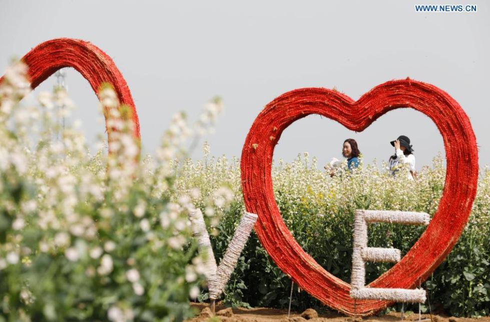 Visitors enjoy the view at a cole flower field in Baofeng County, central China's Henan Province, March 28, 2021. (Xinhua/He Wuchang)