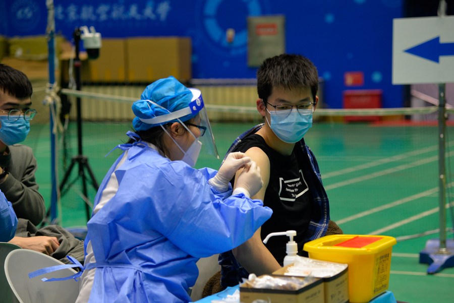 A student receives the second dose of COVID-19 vaccine at the Beihang University in Beijing, capital of China, March 24, 2021. (Xinhua/Xu Qin)