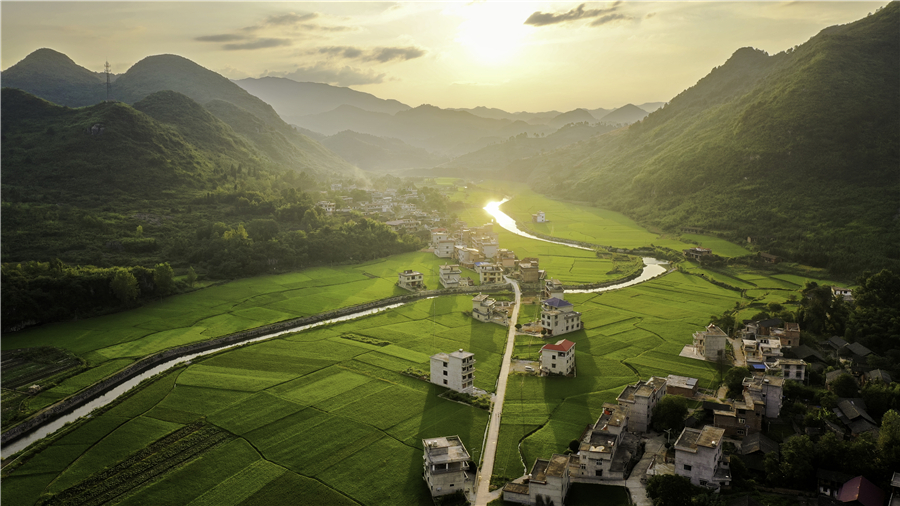The sun sets on Jinxing village in Chengbu Miao ethnic autonomous county, Hunan province. Chengbu was removed from the list of impoverished counties at the beginning of last year, having become a booming tourism and agricultural center. [Photo provided to China Daily]