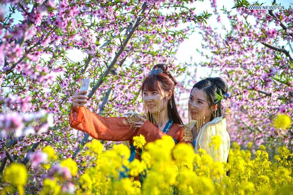 Tourists take selfies at a peach garden demonstration area in Nanbu Township of Handan City, north China's Hebei Province, April 4, 2021. Peach blossoms are in full bloom in Nanbu Township, attracting many tourists. (Xinhua/Wang Xiao)