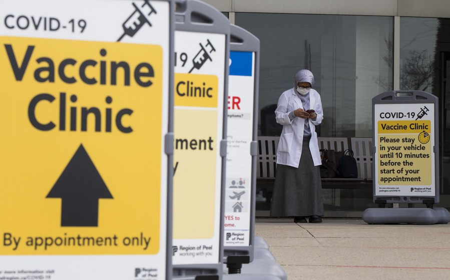 A woman wearing a face mask is seen outside a COVID-19 vaccine clinic in Mississauga, Ontario, Canada, on April 6, 2021. (Photo by Zou Zheng/Xinhua)