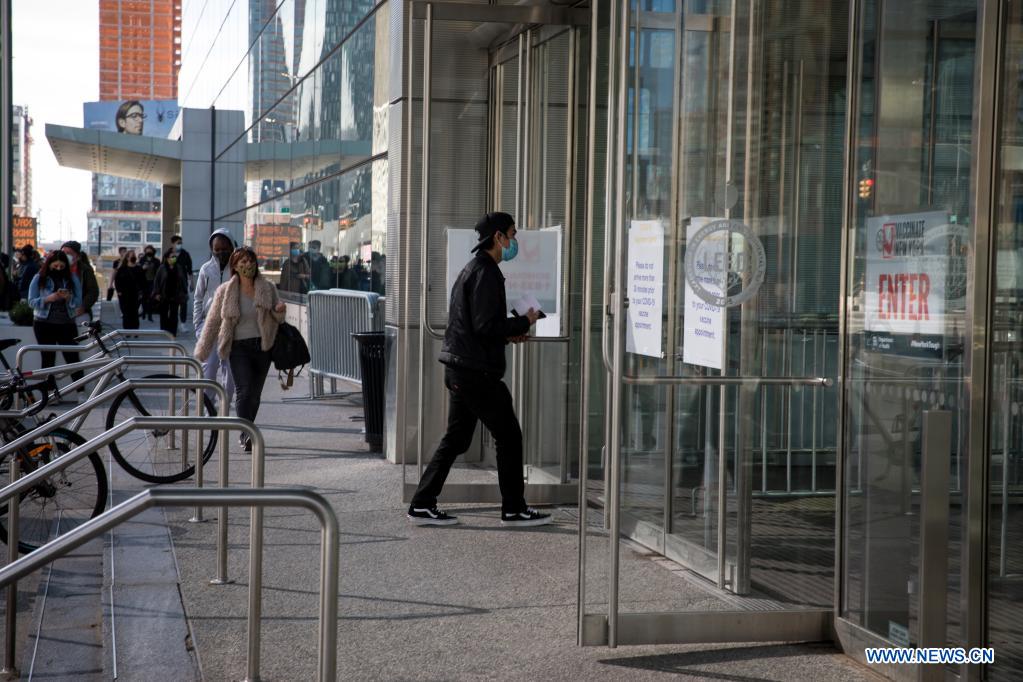 A man enters a COVID-19 vaccination site at the Javits Center in New York, United States, April 6, 2021. U.S. President Joe Biden announced Tuesday that all American adults will be eligible for COVID-19 vaccine by April 19. About 168 million COVID-19 vaccine shots have been administered as of Tuesday, while more than 219 million COVID-19 vaccine doses have been distributed across the country, CDC data show. (Photo by Michael Nagle/Xinhua)