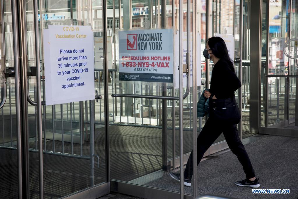 A woman enters a COVID-19 vaccination site at the Javits Center in New York, United States, April 6, 2021. U.S. President Joe Biden announced Tuesday that all American adults will be eligible for COVID-19 vaccine by April 19. About 168 million COVID-19 vaccine shots have been administered as of Tuesday, while more than 219 million COVID-19 vaccine doses have been distributed across the country, CDC data show. (Photo by Michael Nagle/Xinhua)