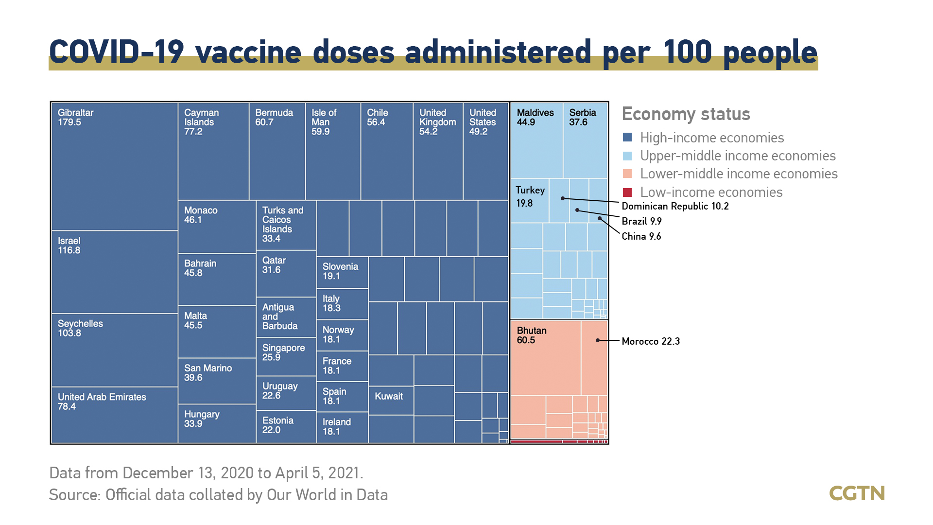 As of April 1, of the half billion vaccines administered, 86 percent were in high-income economies and 0.1 percent in low-income economies.