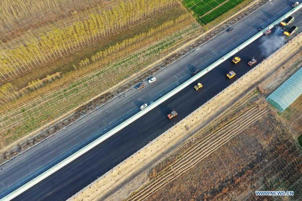 Aerial photo taken on April 7, 2020 shows the construction site of the Beijing-Dezhou expressway in north China's Hebei Province. The first phase of the expressway linking Beijing Daxing International Airport and Dezhou City in Hebei is expected to be put into operation in May 2021. (Xinhua/Mu Yu)
