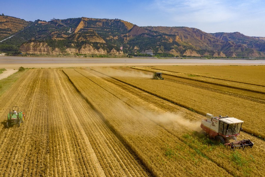 Aerial photo taken on June 5, 2020 shows agricultural machinery harvesting wheat at a cooperative in Sanmenxia City, central China's Henan Province. (Photo by Du Jie/Xinhua)