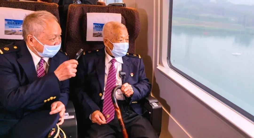 Photo shows Ren Zhongde (R) on the G1504 bullet train. (Photo/China State Railway Group Co., Ltd.)