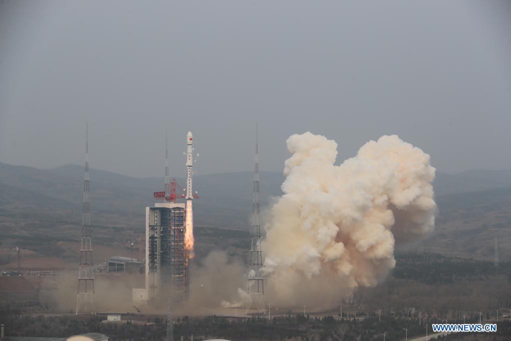 A Long March-4B carrier rocket carrying a satellite, the third of the Shiyan-6 series, blasts off from the Taiyuan Satellite Launch Center in north China's Shanxi Province on April 9, 2021. China successfully sent the experiment satellite into planned orbit Friday. (Photo by Zheng Taotao/Xinhua)