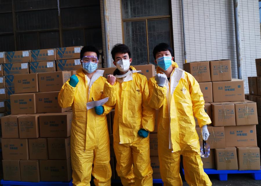 Zhai Chenfei (C), a pilot of China Southern Airlines, poses with volunteers during his work break in Wuhan, central China's Hubei Province, Feb. 22, 2020. (Xinhua)
