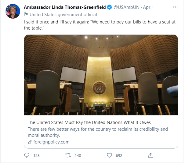 On April 1, U.S. Ambassador to the U.N. Linda Thomas-Greenfield shared a link to the article on Twitter and commented, “I said it once and I’ll say it again: ‘We need to pay our bills to have a seat at the table’,” echoing a speech she made at her confirmation hearing.