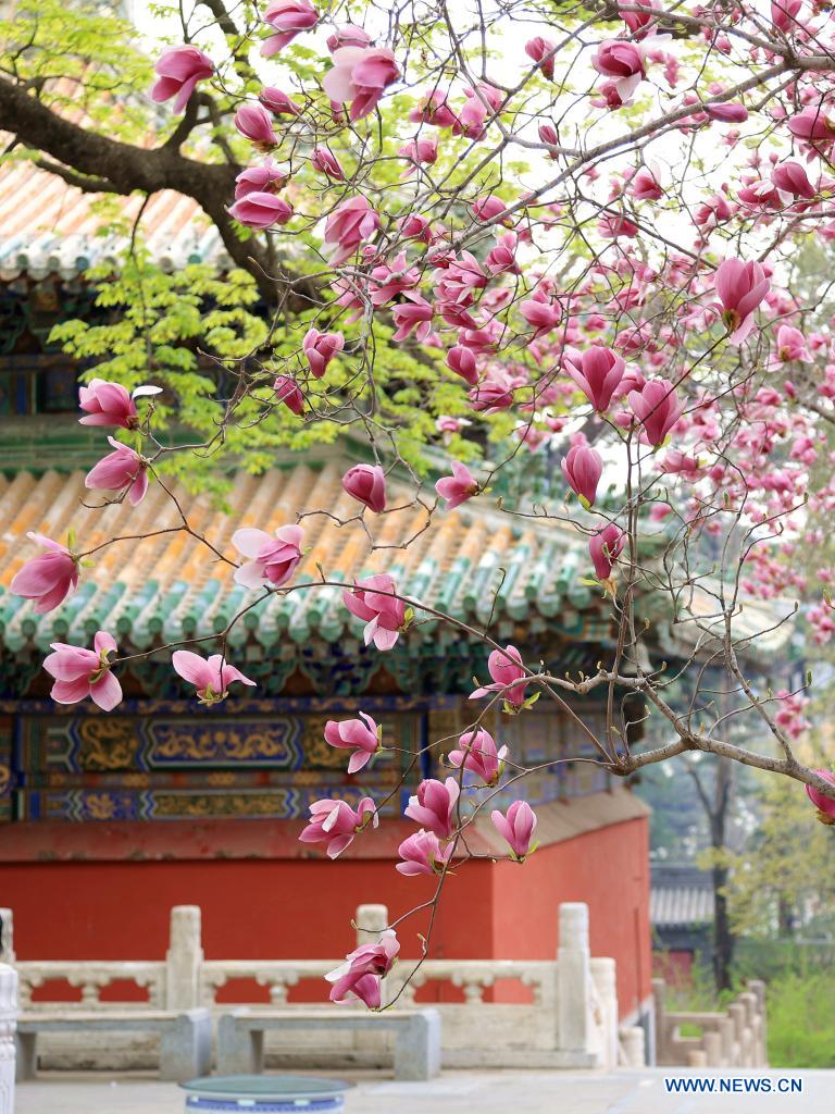Photo taken on April 10, 2021 shows blooming magnolia flowers at Tanzhe Temple in Beijing, capital of China. (Photo by Li Xuezhong/Xinhua)