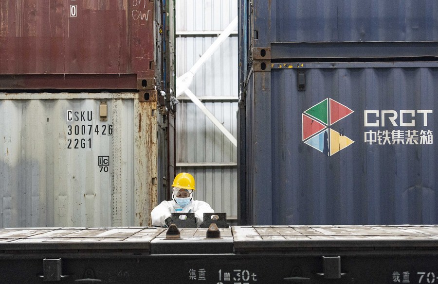A staff member checks a China-Europe freight train in Alataw Pass, northwest China's Xinjiang Uygur Autonomous Region, Feb. 7, 2021. (Xinhua/Ma Kai)