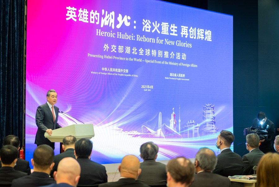 Chinese State Councilor and Foreign Minister Wang Yi speaks at a special event of the Ministry of Foreign Affairs to present Hubei Province to the world, in Beijing, capital of China, April 12, 2021. (Xinhua/Zhai Jianlan)