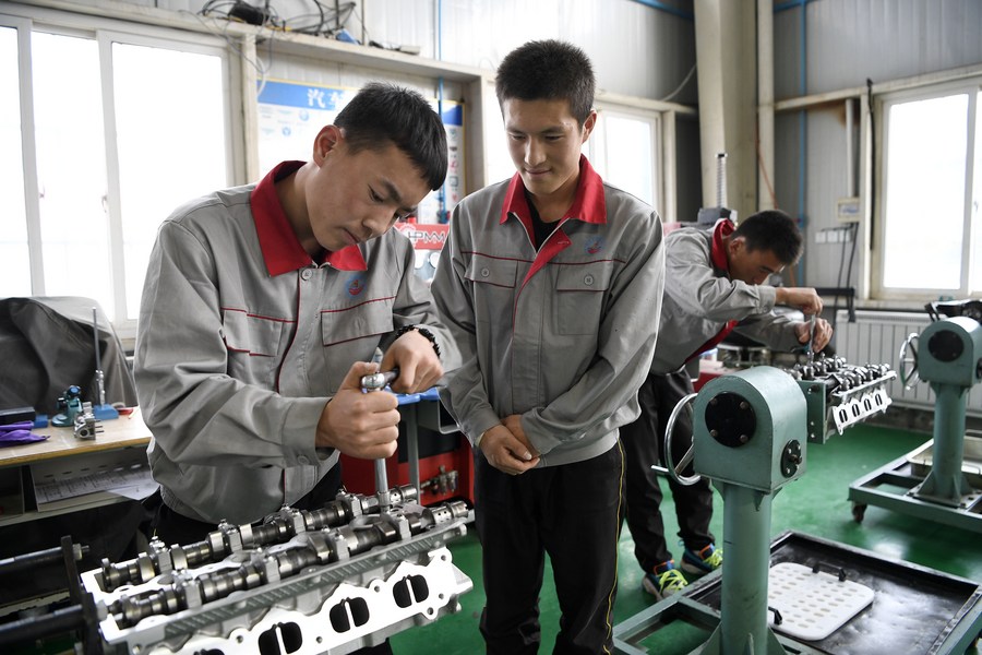 Students have a training class on auto repairing at a vocational school in Xiji County, northwest China's Ningxia Hui Autonomous Region, Sept. 16, 2020. (Xinhua/Wang Peng)