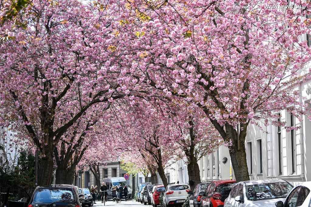 Blooming cherry trees are seen in Bonn, Germany, April 13, 2021. (Photo by Ulrich Hufnagel/Xinhua)