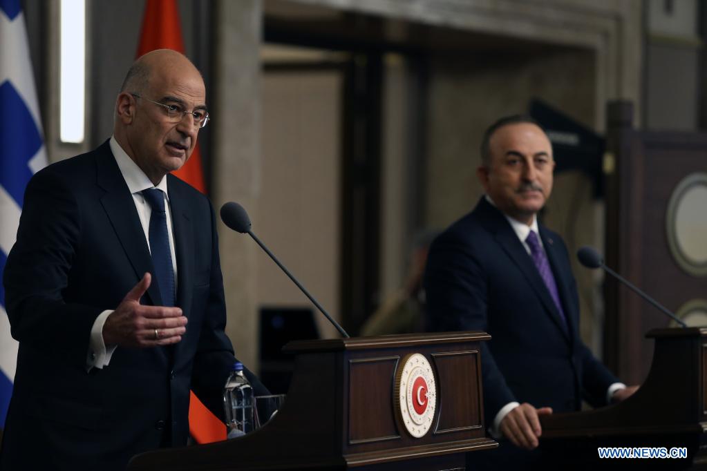 Greek Foreign Minister Nikos Dendias (L) and Turkish Foreign Minister Mevlut Cavusoglu attend a joint press conference in Ankara, Turkey, on April 15, 2021. Turkey believes that its issues with Greece can be resolved through constructive dialogue between the two neighbors and allies, Turkish Foreign Minister Mevlut Cavusoglu said Thursday. (Photo by Mustafa Kaya/Xinhua)
