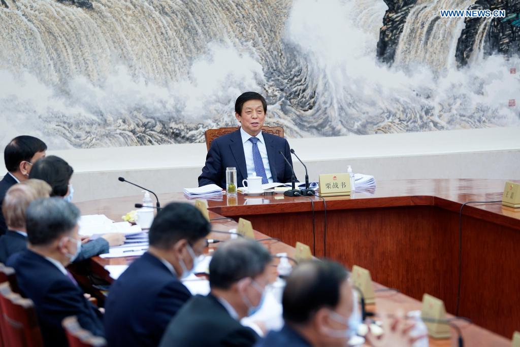 Li Zhanshu, chairman of the National People's Congress (NPC) Standing Committee, presides over the 91st meeting of the Council of Chairpersons of the 13th NPC Standing Committee in Beijing, capital of China, April 16, 2021. (Xinhua/Zhang Ling)