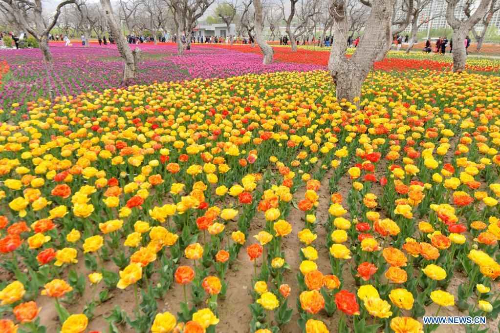 Tulip flowers bloom at Liujiaxia Town of Yongjing County, northwest China's Gansu Province, April 19, 2021. (Photo by Shi Youdong/Xinhua)