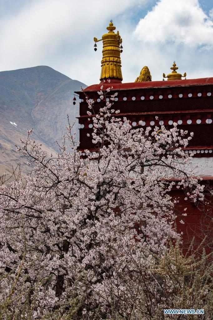 Peach blossoms are seen near the Pabonka Hermitage in the northern suburb of Lhasa, southwest China's Tibet Autonomous Region, April 18, 2021. (Xinhua/Purbu Zhaxi)