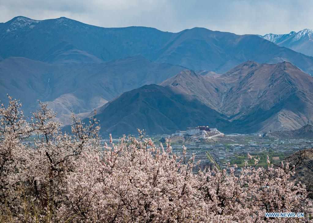 Peach blossoms are seen near the Pabonka Hermitage in the northern suburb of Lhasa, southwest China's Tibet Autonomous Region, April 18, 2021. (Xinhua/Purbu Zhaxi)