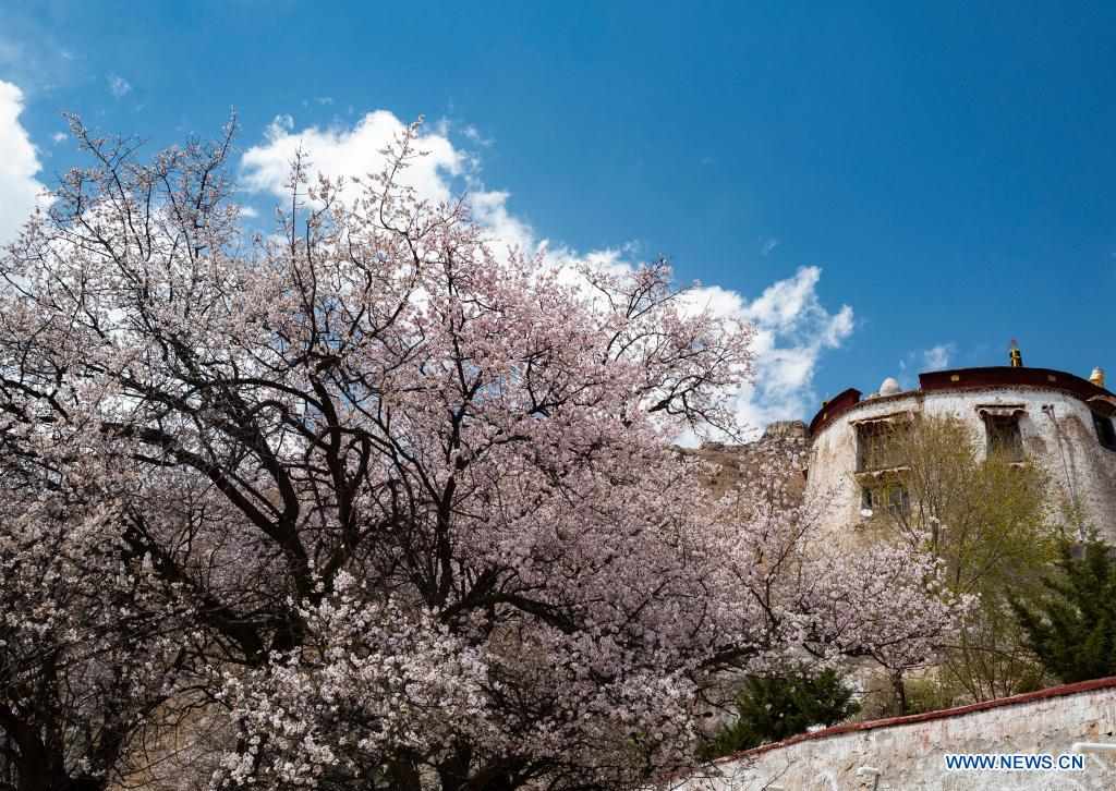 Peach blossoms are seen near the Pabonka Hermitage in the northern suburb of Lhasa, southwest China's Tibet Autonomous Region, April 18, 2021. (Xinhua/Purbu Zhaxi)