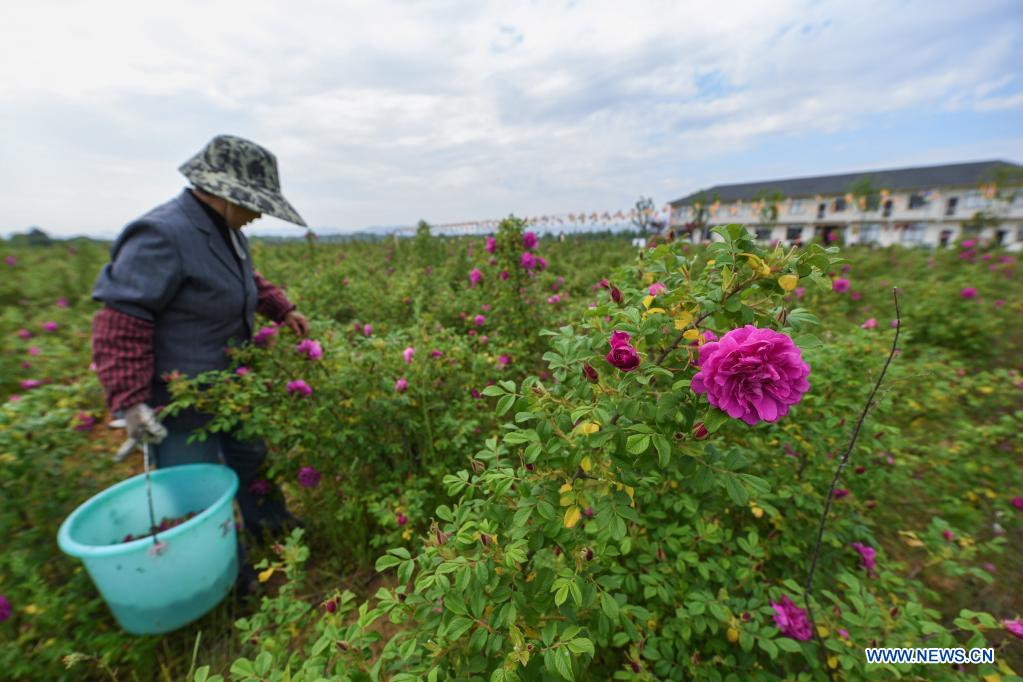 A farmer picks roses at a planting base in Shigugang Village of Changxing County, east China's Zhejiang Province, April 20, 2021. Flowers in planting bases are in full bloom as temperature rises recently in Changxing, attracting tourists and boosting local economic development. (Xinhua/Xu Yu)