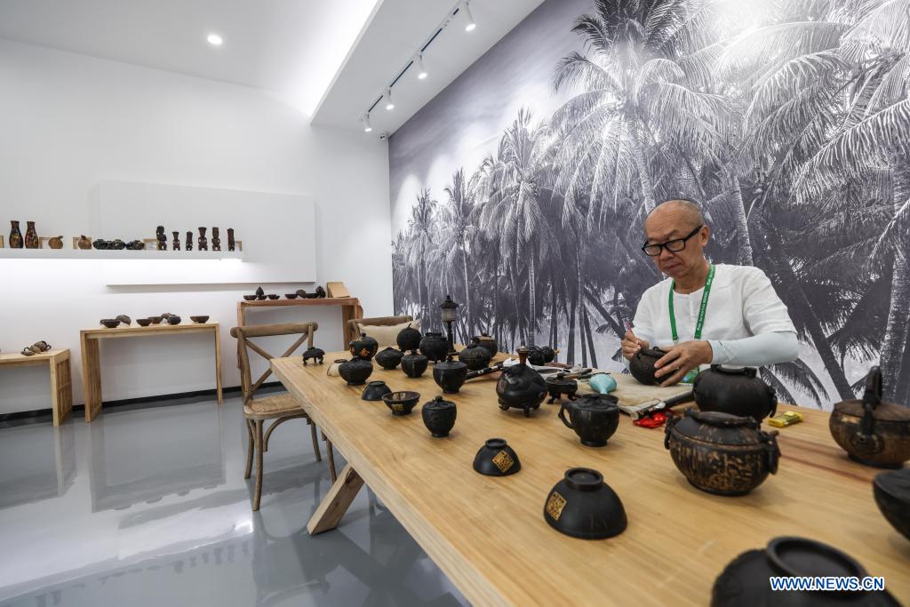 A craftsman makes sculptures with coconut shells at an exhibition hall of the Boao Forum for Asia (BFA) theme park in Boao, south China's Hainan Province, on April 20, 2021. The park, opened to the public on Monday, is located near the BFA permanent venue, comprising nine yards displaying Hainan specialties. (Xinhua/Zhang Liyun)